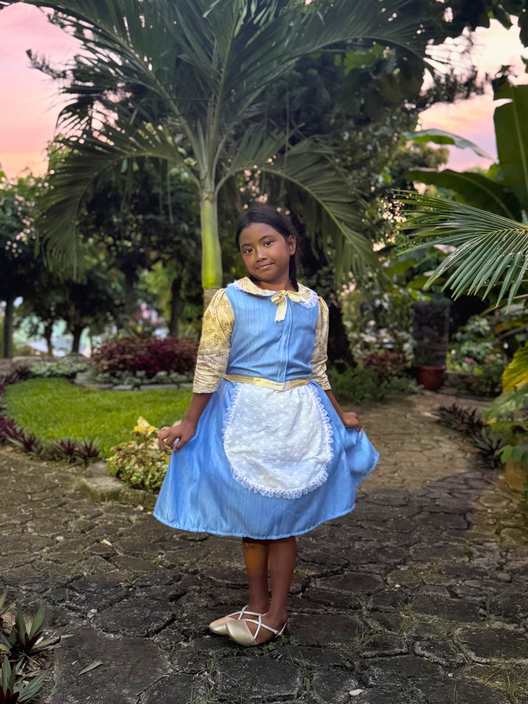 This enchanting blue peasant dress begins with a soft, storybook charm—featuring a classic village-inspired silhouette designed for comfort, movement, and timeless beauty. With a gentle pull and seamless reveal, the dress transforms instantly into a radiant yellow princess gown, inspired by the beloved golden ballroom look of a true fairytale heroine.